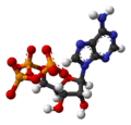 ATP consists of three parts: a sugar, an amine base, and a phosphate group.[5] More specifically, ATP consists of an adenine attached by the #9-nitrogen atom to the 1′ carbon atom of a sugar (ribose), which in turn is attached at the 5' carbon atom of the sugar to a triphosphate group. In its many reactions related to metabolism, the adenine and sugar groups remain unchanged, but the triphosphate is converted to di- and monophosphate, giving respectively the derivatives ADP and AMP. The three phosphoryl groups are labeled as alpha (α), beta (β), and, for the terminal phosphate, gamma (γ).[6]