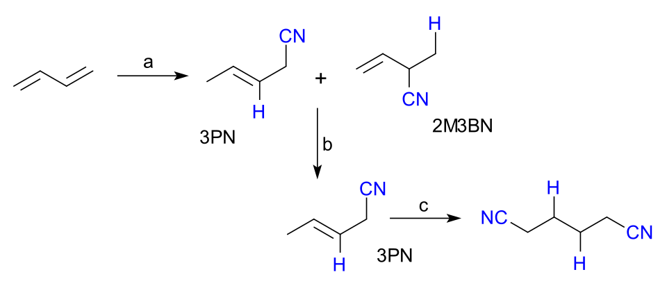The process involves several stages, the first of which involves monohydrocyanation (the addition of one molecule of HCN), affording isomers of pentenenitriles as well as 2- and 3-methylbutenenitriles. These unsaturated nitriles are subsequently isomerized to the 3-and 4-pentenenitriles. In the final stage, these pentenenitriles are subjected to a second hydrocyanation to produce adiponitrile,[4] the anti-Markovnikov product, as well as 2-methylglutaronitrile, a useful byproduct.