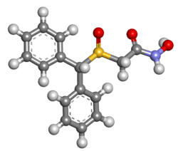 In 1976, two years after the discovery of adrafinil, its active metabolite modafinil was discovered.[20] Modafinil appeared to be more potent than adrafinil in animal studies, and was selected for further clinical development, with both adrafinil and modafinil eventually reaching the market.[20] Modafinil was first approved in France in 1994, and then in the United States in 1998.[21] Lafon was acquired by Cephalon in 2001.[22] As of September 2011, Cephalon has discontinued Olmifon, its adrafinil product, while modafinil continues to be marketed.[7]