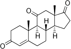 Adrenosterone, also known as Reichstein's substance G , as well as 11-ketoandrostenedione (11-KA4), 11-oxoandrostenedione (11-OXO), and androst-4-ene-3,11,17-trione, is a steroid hormone with an extremely weak androgenic effect, and an intermediate/prohormone of 11-ketotestosterone.[1] It was first isolated in 1936 from the adrenal cortex by Tadeus Reichstein at the Pharmaceutical Institute in the University of Basel. Originally, adrenosterone was called Reichstein's substance G. Adrenosterone occurs in trace amounts in humans as well as most mammals and in larger amounts in fish, where it is a precursor to the primary androgen, 11-ketotestosterone.[2]