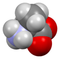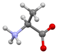 Alanine is one of the twenty canonical α-amino acids used as building blocks (monomers) for the ribosome-mediated biosynthesis of proteins. Alanine is believed to be one of the earliest amino acids to be included in the genetic code standard repertoire.[17][18][19][20] On the basis of this fact the "alanine world" hypothesis was proposed.[21] This hypothesis explains the evolutionary choice of amino acids in the repertoire of the genetic code from a chemical point of view. In this model the selection of monomers (i.e. amino acids) for ribosomal protein synthesis is rather limited to those alanine derivatives that are suitable for building α-helix or β-sheet secondary structural elements. Dominant secondary structures in life as we know it are α-helices and β-sheets and most canonical amino acids can be regarded as chemical derivatives of alanine. Therefore, most canonical amino acids in proteins can be exchanged with alanine by point mutations while the secondary structure remains intact. The fact that alanine mimics the secondary structure preferences of the majority of the encoded amino acids is practically exploited in alanine scanning mutagenesis. In addition, classical X-ray crystallography often employs the polyalanine-backbone model[22] to determine three-dimensional structures of proteins using molecular replacement—a model-based phasing method.