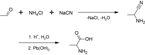 Racemic alanine can be prepared by the condensation of acetaldehyde with ammonium chloride in the presence of sodium cyanide by the Strecker reaction,[15]
