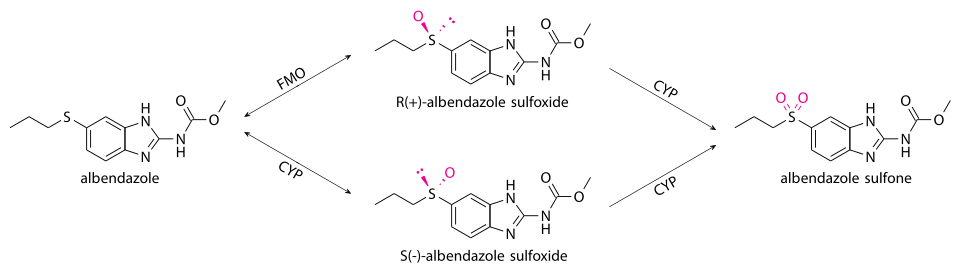 - ^ a b Rawden HC, Kokwaro GO, Ward SA, Edwards G (April 2000). "Relative contribution of cytochromes P-450 and flavin-containing monoxygenases to the metabolism of albendazole by human liver microsomes". British Journal of Clinical Pharmacology. 49 (4): 313–322. doi:10.1046/j.1365-2125.2000.00170.x. PMC 2014938. PMID 10759686.