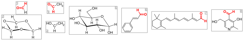 Important aldehydes and related compounds. The aldehyde group (or formyl group) is colored red. From the left: (1) formaldehyde and (2) its trimer 1,3,5-trioxane, (3) acetaldehyde and (4) its enol vinyl alcohol, (5) glucose (pyranose form as α-D-glucopyranose), (6) the flavorant cinnamaldehyde, (7) retinal, which forms with opsins photoreceptors, and (8) the vitamin pyridoxal.