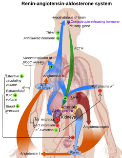 Angiotensin is involved in regulating aldosterone and is the core regulation.[22] Angiotensin II acts synergistically with potassium, and the potassium feedback is virtually inoperative when no angiotensin II is present.[23] A small portion of the regulation resulting from angiotensin II must take place indirectly from decreased blood flow through the liver due to constriction of capillaries.[24] When the blood flow decreases so does the destruction of aldosterone by liver enzymes.