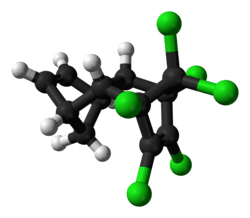 Aldrin is an organochlorine insecticide that was widely used until the 1990s, when it was banned in most countries. Aldrin is a member of the so-called "classic organochlorines" (COC) group of pesticides. COCs enjoyed a very sharp rise in popularity during and after World War II. Other noteworthy examples of COCs include dieldrin and DDT.[3] After research showed that organochlorines can be highly toxic to the ecosystem through bioaccumulation, most were banned from use. Before the ban, it was heavily used as a pesticide to treat seed and soil. Aldrin and related "cyclodiene" pesticides (a term for pesticides derived from Hexachlorocyclopentadiene) became notorious as persistent organic pollutants.[4]