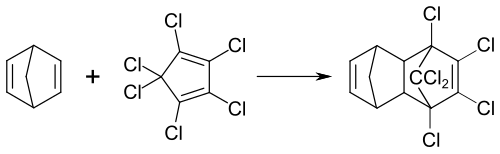 Aldrin is not formed in nature. It is named after the German chemist Kurt Alder, one of the coinventors of this kind of reaction. Aldrin is synthesized by combining hexachlorocyclopentadiene with norbornadiene in a Diels-Alder reaction to give the adduct.[8] In 1967, the composition of technical-grade aldrin was reported to consist of 90.5% of hexachlorohexahydrodimethanonaphthalene (HHDN).[6]