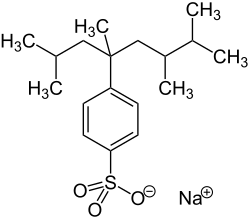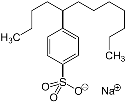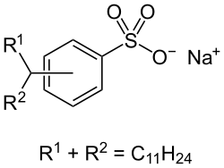 Alkylbenzene sulfonates are a class of anionic surfactants, consisting of a hydrophilic sulfonate head-group and a hydrophobic alkylbenzene tail-group. Along with sodium laureth sulfate, they are one of the oldest and most widely used synthetic detergents and may be found in numerous personal-care products (soaps, shampoos, toothpaste etc.) and household-care products (laundry detergent, dishwashing liquid, spray cleaner etc.).[1] They were introduced in the 1930s in the form of branched alkylbenzene sulfonates (BAS). However following environmental concerns these were replaced with linear alkylbenzene sulfonates (LAS) during the 1960s.[2] Since then production has increased significantly from about one million tons in 1980, to around 3.5 million tons in 2016, making them most produced anionic surfactant after soaps.