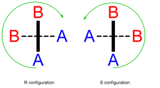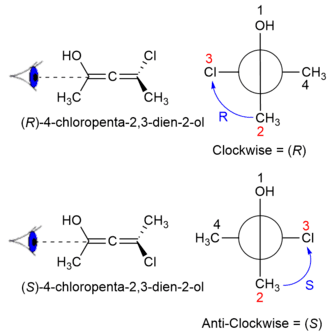 An allene with two different substituents on each of the two carbon atoms will be chiral because there will no longer be any mirror planes. The chirality of these types of allenes was first predicted in 1875 by Jacobus Henricus van 't Hoff, but not proven experimentally until 1935.[9] Where A has a greater priority than B according to the Cahn–Ingold–Prelog priority rules, the configuration of the axial chirality can be determined by considering the substituents on the front atom followed by the back atom when viewed along the allene axis. For the back atom, only the group of higher priority need be considered.