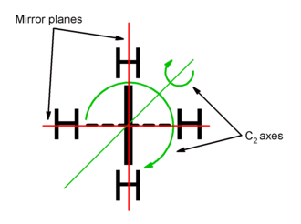 The symmetry and isomerism of allenes has long fascinated organic chemists.[8] For allenes with four identical substituents, there exist two twofold axes of rotation through the central carbon atom, inclined at 45° to the CH2 planes at either end of the molecule. The molecule can thus be thought of as a two-bladed propeller. A third twofold axis of rotation passes through the C=C=C bonds, and there is a mirror plane passing through both CH2 planes. Thus this class of molecules belong to the D2d point group. Because of the symmetry, an unsubstituted allene has no net dipole moment, that is, it is a non-polar molecule.