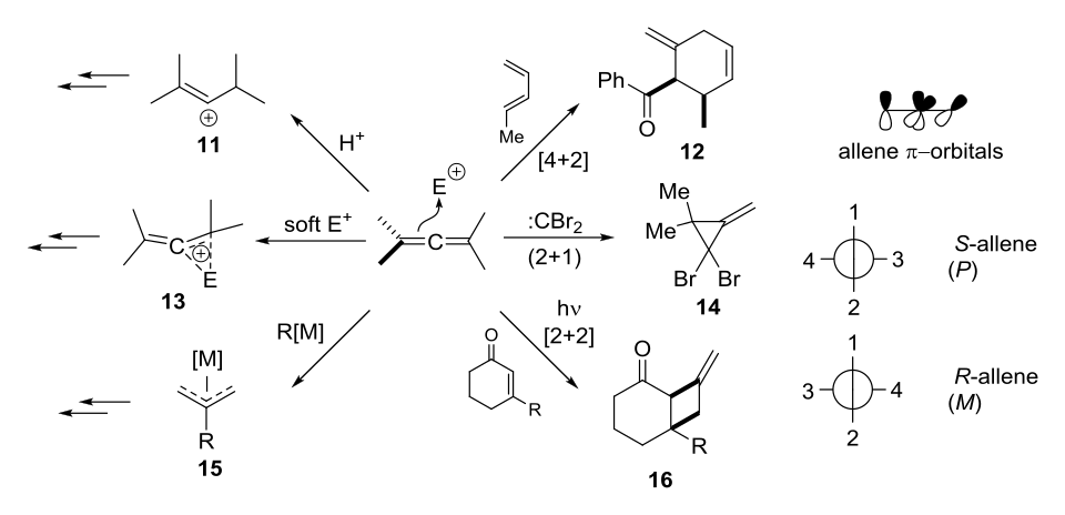 The two π-bonds are located at the 90° angle to each other, and thus require a reagent to approach from somewhat different directions. With an appropriate substitution pattern, allenes exhibit axial chirality as predicted by Van 't Hoff as early as 1875.[64][63] Protonation of allenes gives cations 11 that undergo further transformations.[65] Reactions with soft electrophiles (e.g. Br+) deliver positively charged onium ions 13.[66] Transition-metal-catalysed reactions proceed via allylic intermediates 15 and have attracted significant interest in recent years.[67][68] Numerous cycloadditions are also known, including [4+2]-, (2+1)-, and [2+2]-variants, which deliver, e.g., 12, 14, and 16, respectively.[19][69][70][71]
