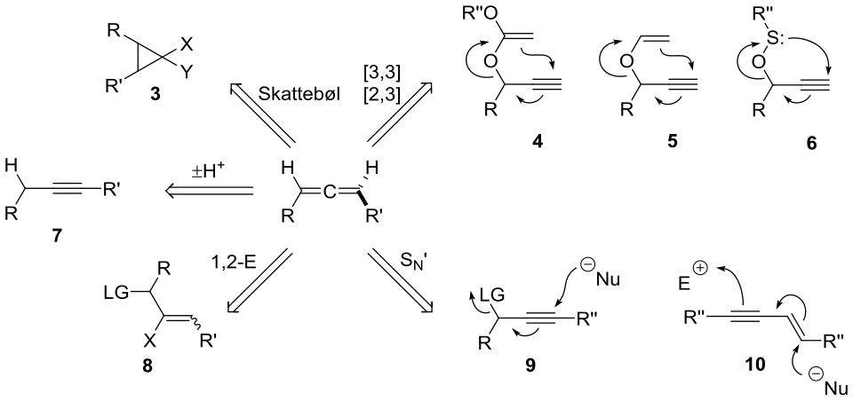 The chemistry of allenes has been reviewed in a number of books[2][38][39][40] and journal articles.[3][19][41][42][43][44][45][46][47] Some key approaches towards allenes are outlined in the following scheme:[48][49][50][51]
