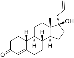 Allylestrenol, also known as 3-deketo-17α-allyl-19-nortestosterone or as 17α-allylestr-4-en-17β-ol, is a synthetic estrane steroid and a derivative of testosterone.[58] It is a member of the estrane subgroup of the 19-nortestosterone family of progestins,[59] but unlike most other 19-nortestosterone progestins, is not a derivative of norethisterone (17α-ethynyl-19-nortestosterone).[60][3][18] This is because it possesses an allyl group at the C17α position rather than the usual ethynyl group.[60][3][18] As such, along with altrenogest (17α-allyl-19-nor-δ9,11-testosterone), allylestrenol is a derivative of 17α-allyltestosterone rather than of 17α-ethynyltestosterone.[60][3][18]