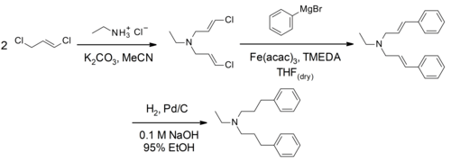 Another way uses (E)-1,3-dichloropropene as a starting substrate. It is reacted with ethylamine hydrochloride and potassium carbonate in anhydrous acetonitrile, yielding (2E)-3-chloro-N-[(2E)-3-chloroprop-2-en-1-yl]-N-ethylprop-2-en-1-amine. Then, chlorine atoms are substituted with phenyl substituents in a Gringard reaction using phenylmagnesium bromide, tris(acetylacetonato)iron(III) (Fe(acac)3) as a catalyst and tetramethylethylenediamine (TMEDA) in dry tetrahydrofuran, yielding an unsaturated analogue of alverine, which is then hydrogenated using a palladium on carbon catalyst in alkaline ethanol, yielding alverine.[9]