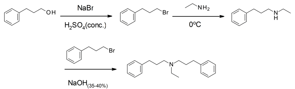 One way to synthesis alverine is conducted using phenylpropanol, which is brominated using sodium bromide in concentrated sulfuric acid heated to reflux, yielding (3-bromopropyl)benzene. Then, in an ice bath, it is reacted with ethylamine, yielding N-ethyl-3-phenylpropan-1-amine. Then, it is reacted with (3-bromopropyl)benzene again in alkaline pH obtained using sodium hydroxide, finally yielding alverine.[8]