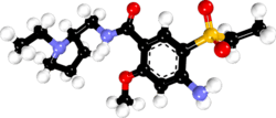 Amisulpride, sold under the brand names Socian and Barhemsys, is a medication used in the treatment of schizophrenia, acute psychotic episodes, depression, and nausea and vomiting.[9][6] It is specifically used at lower doses intravenously to prevent and treat postoperative nausea and vomiting,[9] at low doses by mouth to treat depression, and at higher doses by mouth to treat psychosis.[6][10][11]