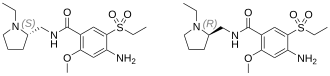 Amisulpride shows stereoselectivity in its actions.[49] Aramisulpride ((R)-amisulpride) has higher affinity for the 5-HT7 receptor (Ki = 47 nM vs. 1,900 nM) while esamisulpride ((S)-amisulpride) has higher affinity for the D2 receptor (4.0 nM vs. 140 nM).[49][50]