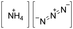 Ammonium azide is the chemical compound with the formula [NH4]N3, being the salt of ammonia and hydrazoic acid. Like other inorganic azides, this colourless crystalline salt is a powerful explosive, although it has a remarkably low sensitivity. [NH4]N3 is physiologically active and inhalation of small amounts causes headaches and palpitations. It was first obtained by Theodor Curtius in 1890, along with other azides.