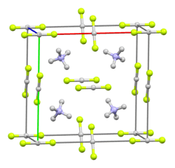 In solid form ([NH4][HF2]), ammonium biflouride is similar to other fluoride salts.[4] Its crystal system is orthorhombic,[5] with each cation coordinated with four anions in a tetrahedron (and vice versa). Hydrogen atoms in the ammonium ion form hydrogen bonds with the fluorine atoms, and in the resulting structure, N-H-F are roughly colinear.[6][7] As a result of these hydrogen bonds, this crystal structure varies from those of other bifluoride salts, such as potassium bifluoride and rubidium bifluoride.[5]