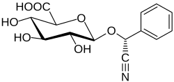 Amygdalin was first isolated in 1830 from bitter almond seeds (Prunus dulcis) by Pierre-Jean Robiquet and Antoine Boutron-Charlard.[22] Justus von Liebig and Friedrich Woehler found three hydrolysis products of amygdalin: sugar, benzaldehyde, and hydrogen cyanide.[23] Later research showed that sulfuric acid hydrolyzes it into D-glucose, benzaldehyde, and hydrogen cyanide; while hydrochloric acid gives mandelic acid, D-glucose, and ammonia.[24]