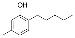 AMC is a derivative of m-cresol, with a pentyl group attached to the sixth carbon atom. The pure substance melts at 24 °C (75 °F), and boils between 137 and 139 °C (279 and 282 °F) at a pressure of 6.7 kilopascals (50 mmHg). It is soluble in water, ethanol, acetone, diethylether, and oil.[6]