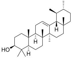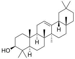 The amyrins are three closely related natural chemical compounds of the triterpene class. They are designated α-amyrin (ursane skeleton),[3] β-amyrin (oleanane skeleton),[4] and δ-amyrin. Each is a pentacyclic triterpenol with the chemical formula C30H50O. They are widely distributed in nature and have been isolated from a variety of plant sources such as epicuticular wax. In plant biosynthesis, α-amyrin is the precursor of ursolic acid and β-amyrin is the precursor of oleanolic acid.[5] All three amyrins occur in the surface wax of tomato fruit.[6][7] α-Amyrin is found in dandelion coffee.
