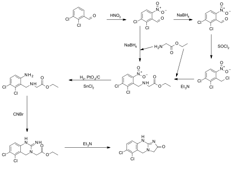 Condensation of benzyl chloride 1 with ethyl ester of glycine gives alkylated product 2. Reduction of the nitro group leads to the aniline and reaction of this with cyanogen bromide possibly gives cyanamide 3 as the initial intermediate. Addition of the aliphatic would then lead to formation of the quinazoline ring (4). Amide formation between the newly formed imide and the ester would then serve to form the imidazolone ring, whatever the details of the sequence, there is obtained anagrelide (5).