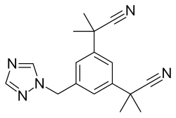 Anastrozole is a nonsteroidal benzyl triazole.[4][5] It is also known as α,α,α',α'-tetramethyl-5-(1H-1,2,4-triazol-1-ylmethyl)-m-benzenediacetonitrile.[1] Anastrozole is structurally related to letrozole, fadrozole, and vorozole, with all being classified as azoles.[30][31][32][33]