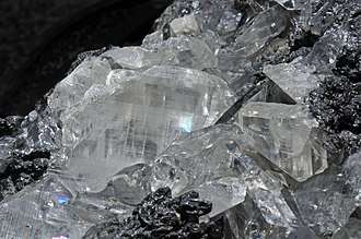 It was first recognized as a mineral species by William Withering in 1783, who discovered it in the Parys copper-mine in Anglesey; the name anglesite, from this locality, was given by F. S. Beudant in 1832. The crystals from Anglesey, which were formerly found abundantly on a matrix of dull limonite, are small in size and simple in form, being usually bounded by four faces of a prism and four faces of a dome; they are brownish-yellow in colour owing to a stain of limonite. Crystals from some other localities, notably from Monteponi in Sardinia, are transparent and colourless, possessed of a brilliant adamantine lustre, and usually modified by numerous bright faces. The variety of combinations and habits presented by the crystals is very extensive, nearly two hundred distinct forms being figured by V. von Lang in his monograph of the species; without measurement of the angles the crystals are frequently difficult to decipher. There are distinct cleavages parallel to the faces of the prism (110) and the basal plane (001), but these are not so well developed as in the isomorphous minerals barite and celestite.[5]