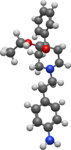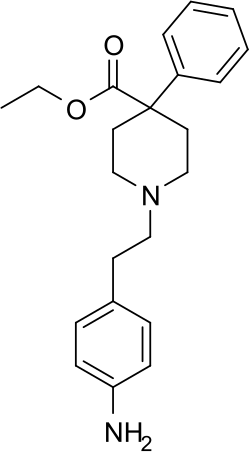 Anileridine (trade name: Leritine) is a synthetic analgesic drug[2] and is a member of the piperidine class of analgesic agents[3] developed by Merck & Co. in the 1950s.[4] It differs from pethidine (meperidine) in that the N-methyl group of meperidine is replaced by an N-aminophenethyl group, which increases its analgesic activity.