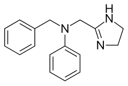 Antazoline is a 1st generation antihistamine with anticholinergic properties used to relieve nasal congestion and in eye drops, usually in combination with naphazoline, to relieve the symptoms of allergic conjunctivitis.[2] To treat allergic conjunctivitis, antazoline can be combined in a solution with tetryzoline.[3] The drug is a Histamine H1 receptor antagonist:[4] selectively binding to but not activating the receptor, thereby blocking the actions of endogenous histamine and subsequently leading to the temporary relief of the negative symptoms brought on by histamine.