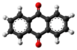 Anthraquinone, also called anthracenedione or dioxoanthracene, is an aromatic organic compound with formula C 14H 8O 2. Several isomers exist but these terms usually refer to 9,10-anthraquinone (IUPAC: 9,10-dioxoanthracene) wherein the keto groups are located on the central ring. It is used as a digester additive to wood pulp for papermaking. Many anthraquinone derivatives are generated by organisms or synthesised industrially for use as dyes, pharmaceuticals, and catalysts. Anthraquinone is a yellow, highly crystalline solid, poorly soluble in water but soluble in hot organic solvents. It is almost completely insoluble in ethanol near room temperature but 2.25 g will dissolve in 100 g of boiling ethanol. It is found in nature as the rare mineral hoelite.