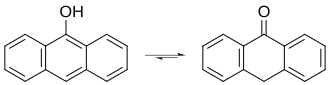 Anthrone is the more stable tautomer relative to the anthrol as has been established also by X-ray crystallography.[6] The tautomeric equilibrium is estimated at 100 in aqueous solution. For the two other isomeric anthrols, the tautomeric equilibrium is reversed: they are phenolic.[7]