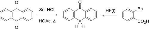 An alternative synthesis involves cyclization of o-benzylbenzoic acid induced with hydrogen fluoride.[4]