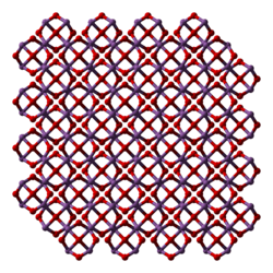 The structure of Sb2O3 depends on the temperature of the sample. Dimeric Sb4O6 is the high temperature (1560 °C) gas.[10] Sb4O6 molecules are bicyclic cages, similar to the related oxide of phosphorus(III), phosphorus trioxide.[11] The cage structure is retained in a solid that crystallizes in a cubic habit. The Sb–O distance is 197.7 pm and the O–Sb–O angle of 95.6°.[12] This form exists in nature as the mineral senarmontite.[11] Above 606 °C, the more stable form is orthorhombic, consisting of pairs of -Sb-O-Sb-O- chains that are linked by oxide bridges between the Sb centers. This form exists in nature as the mineral valentinite.[11]