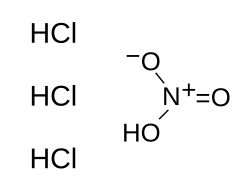 - ^ The relative concentrations of the two acids in water differ; values could be 65% w/v for nitric acid and 35% w/v for hydrochloric acid – that is, the actual HNO3:HCl mass ratio is less than 1:2.