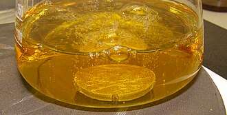 Aqua regia (/ˈreɪɡiə, ˈriːdʒiə/; from Latin, "regal water" or "royal water") is a mixture of nitric acid and hydrochloric acid, optimally in a molar ratio of 1:3.[b] Aqua regia is a fuming liquid. Freshly prepared aqua regia is colorless, but it turns yellow, orange, or red within seconds from the formation of nitrosyl chloride and nitrogen dioxide. It was so named by alchemists because it can dissolve noble metals, such as gold and platinum, while leaving many other metals unaffected. It has been used to process or conceal gold into the modern era.