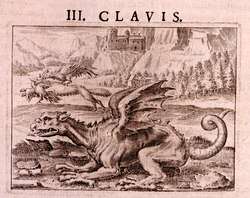 The third of Basil Valentine's keys (c. 1600) shows a dragon in the foreground and a fox eating a rooster in the background. The rooster symbolizes gold (from its association with sunrise and the sun's association with gold), and the fox represents aqua regia. The repetitive dissolving, heating, and redissolving (the rooster eating the fox eating the rooster) leads to the buildup of chlorine gas in the flask. The gold then crystallizes in the form of gold(III) chloride, whose red crystals Basil called "the rose of our masters" and "the red dragon's blood".[10] The reaction was not reported again in the chemical literature until 1895.[11]