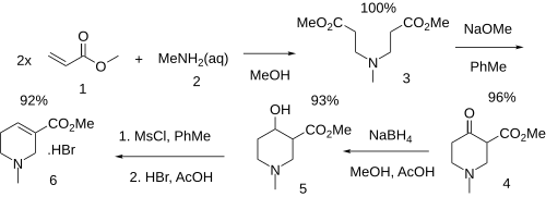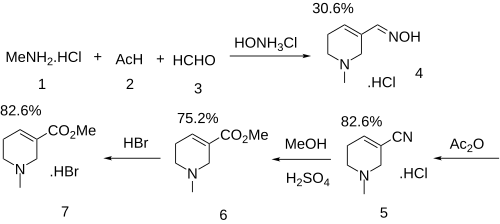 Fischer esterification of nicotinic acid (niacin) (1) gives methyl nicotinate (2). Alkylation with methyl iodide then gives 3-methoxycarbonyl-1-methylpyridinium iodide (3). Hydride reduction with an agent such as potassium borohydride thus gives the tetrahydropyridine (4). Salt formation with HBr completes the synthesis (5).