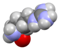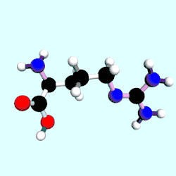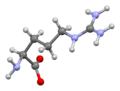 Arginine is the amino acid with the formula (H2N)(HN)CN(H)(CH2)3CH(NH2)CO2H. The molecule features a guanidino group appended to a standard amino acid framework. At physiological pH, the carboxylic acid is deprotonated (−CO2−) and both the amino and guanidino groups are protonated, resulting in a cation. Only the l-arginine (symbol Arg or R) enantiomer is found naturally.[1] Arg residues are common components of proteins. It is encoded by the codons CGU, CGC, CGA, CGG, AGA, and AGG.[2] The guanidine group in arginine is the precursor for the biosynthesis of nitric oxide.[3] Like all amino acids, it is a white, water-soluble solid.