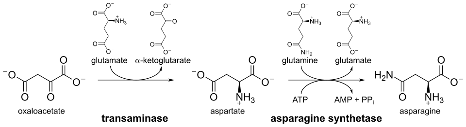 The precursor to asparagine is oxaloacetate, which a transaminase enzyme converts to aspartate. The enzyme transfers the amino group from glutamate to oxaloacetate producing α-ketoglutarate and aspartate. The enzyme asparagine synthetase produces asparagine, AMP, glutamate, and pyrophosphate from aspartate, glutamine, and ATP. Asparagine synthetase uses ATP to activate aspartate, forming β-aspartyl-AMP. Glutamine donates an ammonium group, which reacts with β-aspartyl-AMP to form asparagine and free AMP.[21]