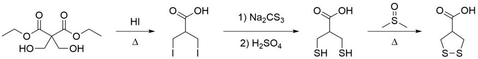 A convenient synthesis of asparagusic acid has been developed from a commercially available diethyl malonate derivative starting material, improving on the prior method of Jansen.[5] Diethyl bis(hydroxymethyl)malonate is treated with hydroiodic acid to yield β,β'-diiodoisobutyric acid after decarboxylation and ester hydrolysis (with removal of volatile ethanol and carbon dioxide). Dihydroasparagusic acid, the reduced (dithiol) form of asparagusic acid, is produced by sequential reaction with sodium trithiocarbonate (Na2CS3) and sulfuric acid; subsequent oxidation with hot dimethyl sulfoxide yields asparagusic acid.[1]
