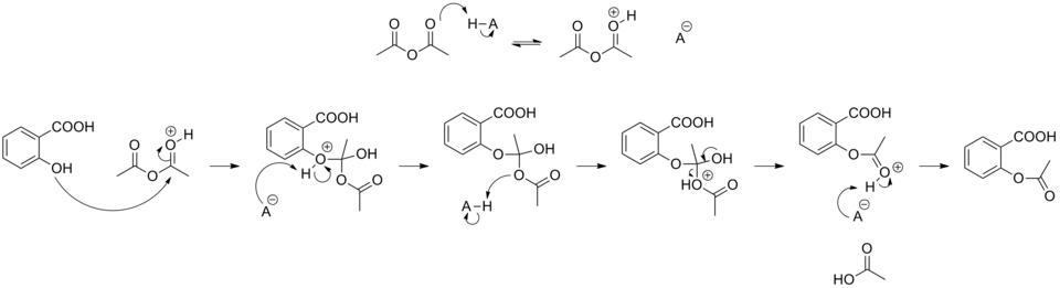 Reaction between acetic acid and salicylic acid can also form aspirin but this esterification reaction is reversible and the presence of water can lead to hydrolysis of the aspirin. So, an anhydrous reagent is preferred.[29]