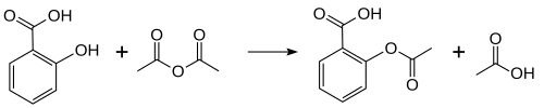 The synthesis of aspirin is classified as an esterification reaction. Salicylic acid is treated with acetic anhydride, an acid derivative, causing a chemical reaction that turns salicylic acid's hydroxyl group into an ester group (R-OH → R-OCOCH3). This process yields aspirin and acetic acid, which is considered a byproduct of this reaction. Small amounts of sulfuric acid (and occasionally phosphoric acid) are almost always used as a catalyst. This method is commonly demonstrated in undergraduate teaching labs.[28]