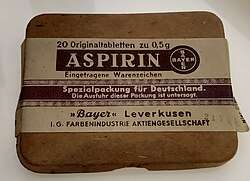 In 1897, scientists at the Bayer company began studying acetylsalicylic acid as a less-irritating replacement medication for common salicylate medicines.[15]: 69–75 [22] By 1899, Bayer had named it "Aspirin" and was selling it around the world.[17]