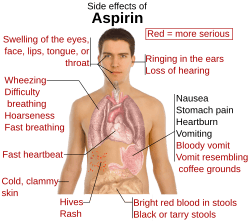 One common adverse effect is an upset stomach.[11] More significant side effects include stomach ulcers, stomach bleeding, and worsening asthma.[11] Bleeding risk is greater among those who are older, drink alcohol, take other NSAIDs, or are on other blood thinners.[11] Aspirin is not recommended in the last part of pregnancy.[11] It is not generally recommended in children with viral infections because of the risk of Reye syndrome.[11] High doses may result in ringing in the ears.[11]