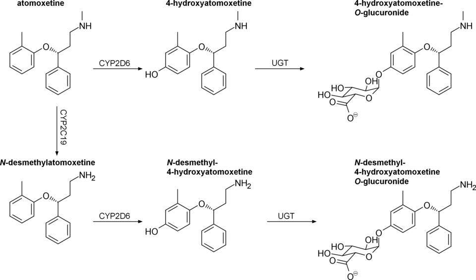- ^ a b Sauer JM, Ponsler GD, Mattiuz EL, Long AJ, Witcher JW, Thomasson HR, et al. (January 2003). "Disposition and metabolic fate of atomoxetine hydrochloride: the role of CYP2D6 in human disposition and metabolism". Drug Metabolism and Disposition. 31 (1): 98–107. doi:10.1124/dmd.31.1.98. PMID 12485958. S2CID 13032441.