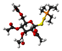 Auranofin is used to treat rheumatoid arthritis. It improves arthritis symptoms including painful or tender and swollen joints and morning stiffness.[4] Auranofin is a safer treatment compared to the more common injectable gold thiolates (gold sodium thiomalate and gold thioglucose), but meta-analysis of 66 clinical trials concluded that it is somewhat less effective.[5]