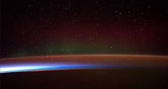 Auroras result from emissions of photons in Earth's upper atmosphere, above 80 km (50 mi), from ionized nitrogen atoms regaining an electron, and oxygen atoms and nitrogen-based molecules returning from an excited state to the ground state.[60] They are ionized or excited by the collision of particles precipitated into the atmosphere. Both incoming electrons and protons may be involved. Excitation energy is lost within the atmosphere by the emission of a photon, or by collision with another atom or molecule: