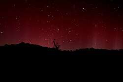 Auroras seen within the auroral oval may be directly overhead. From farther away, they illuminate the poleward horizon as a greenish glow, or sometimes a faint red, as if the Sun were rising from an unusual direction. Auroras also occur poleward of the auroral zone as either diffuse patches or arcs,[19] which can be subvisual.